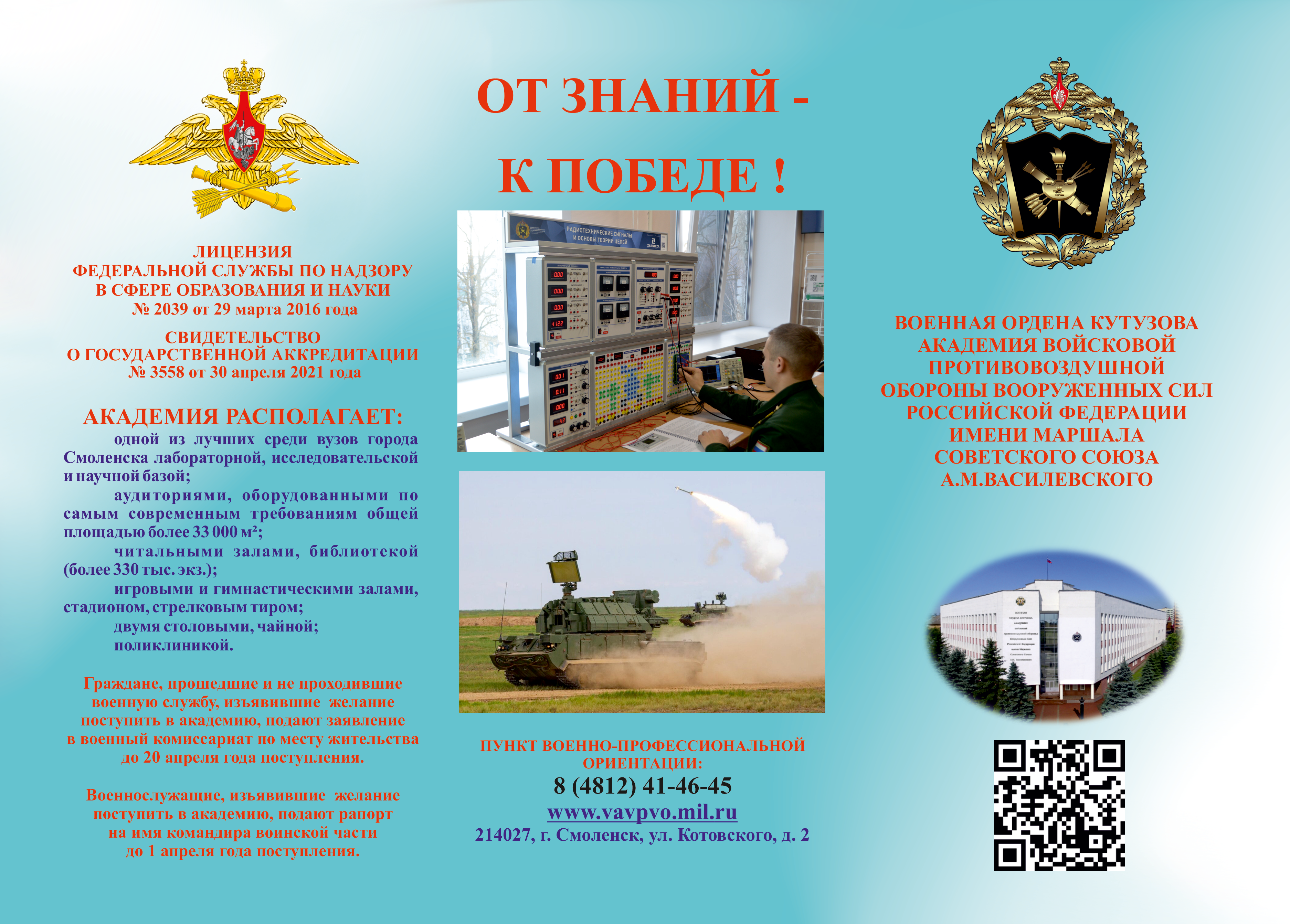 Сегодня академия войсковой ПВО – это 17 кафедр, четыре факультета и научно-исследовательский центр, где трудятся более 300 ученых, в том числе 30 докторов наук. Эффективно работает докторский диссертационный совет, успешно функционируют ученый и научно-экспертный советы, Смоленские региональные отделения Академии военных наук, Объединенного фонда электронных ресурсов «Наука и образование».