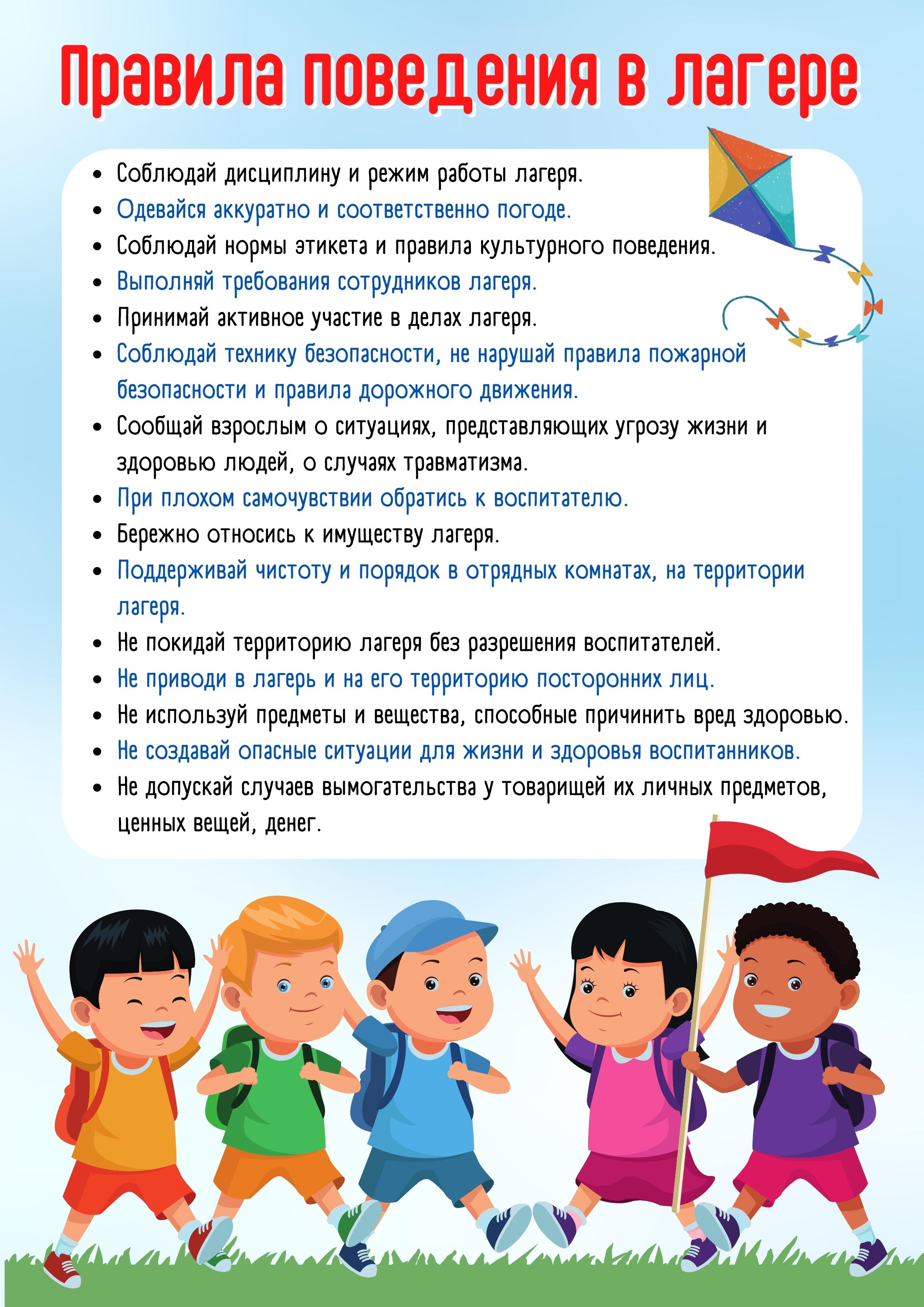Режим пребывания детей в лагере - с 08:30 до 14:30 ежедневно с понедельника по пятницу;